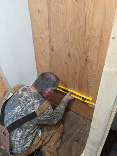Tyler from Plumbing Solutions also came out and drilled the holes in the floor for the grey water: tub/shower, bathroom sink, kitchen sink, and washing machine (which I'm not actually planning on having anytime soon, but I wanted it plumbed and wired for a machine if I change my mind in the future!). To prevent my little mice friends from making a new home in MY home, we sealed up the holes with Gorilla tape until all the plumbing is all installed. There was only one hiccup: where the tub/shower drain was supposed to be was directly over the frame of the trailer hitch. So we had to move the drain over an inch. Not a huge deal, but now we had to build a one-inch thick wall next to the bathroom wall for the tub/shower surround, when it was just supposed to attach directly to the bathroom wall. Oh well - gotta be flexible!